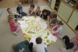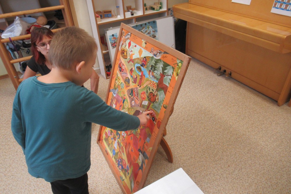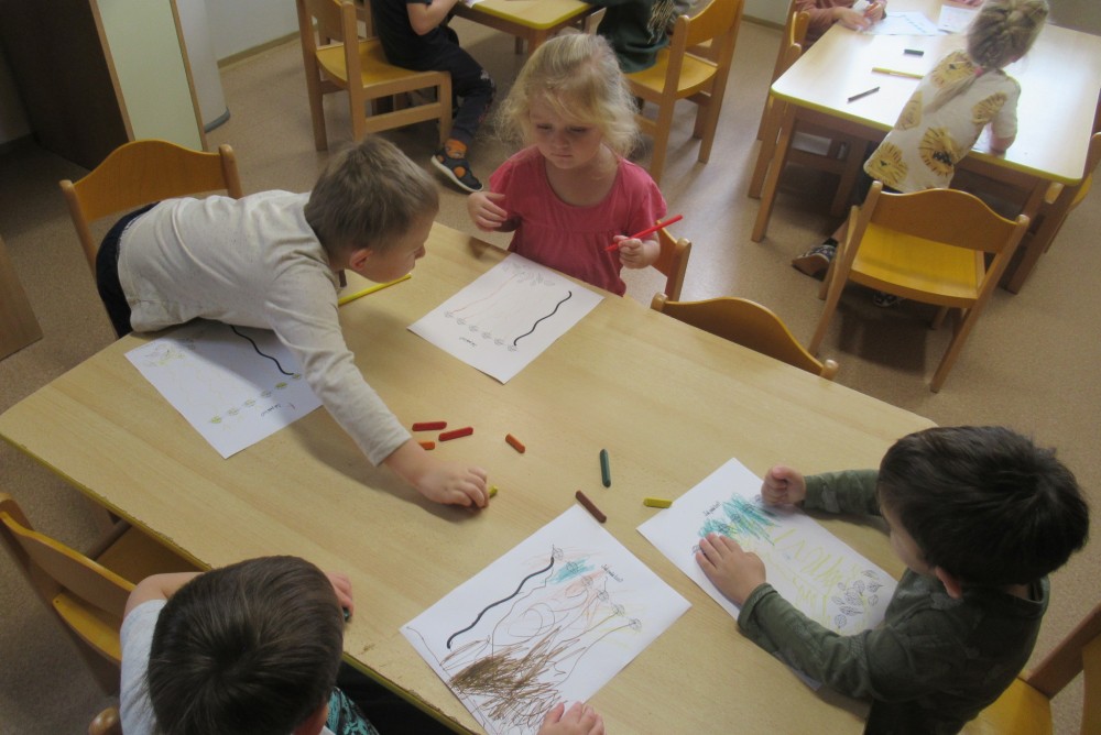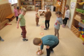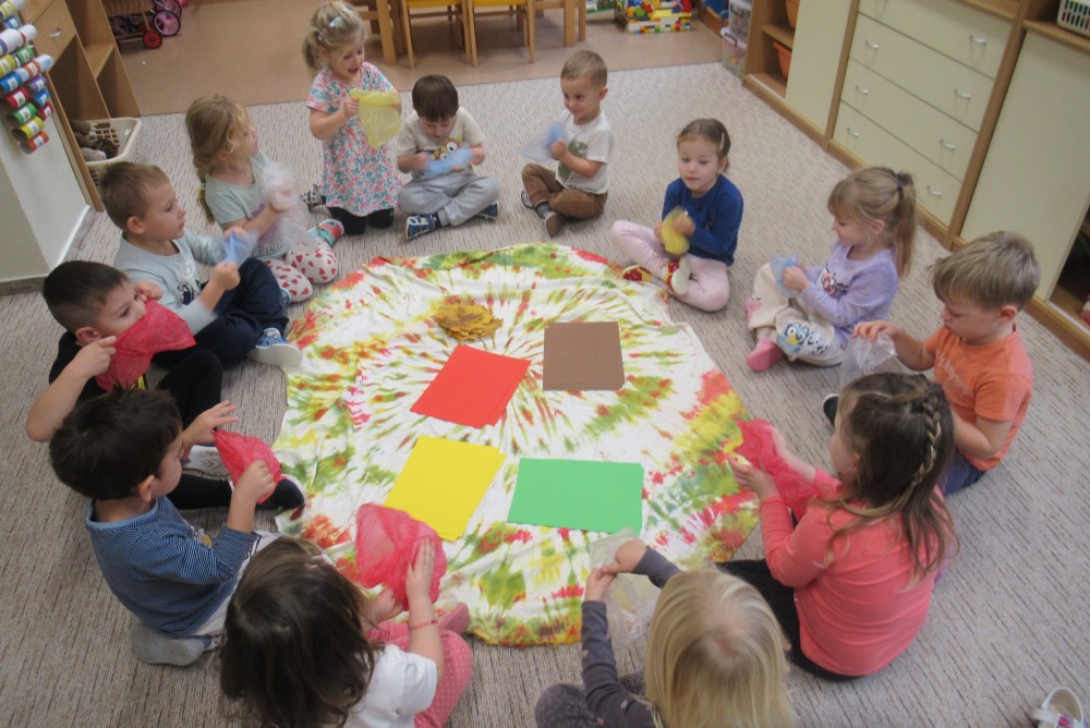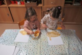 Jaké barvy nám šašek Honzík namíchal na lístky podzimu? Pokud to ještě někdo neví, tak ať se zeptá našich dětí. S dětmi jsme si povídali o barvách, udělali jsme si pokus s barvami a naučili jsme se básničku "Podzim". Na procházce jsme nasbírali javorové lístky na našeho "Vlka". Děti odelovaly barevné lístečky (kuličky), které dávaly na větvičku stromu. Děti malovaly prstíky lístečky a vznikly tak krásné barevné podzimní stromy. Stromy s barevnými lístky si děti zkusily postavit i z dřevěných kostek. Zahráli jsme si hru "Barevné, padající lístečky". a naučili jsme se písničku "Foukej, foukej větříčku," aby nám ty krásné barevné lístečky padaly ze stromů na zem. I v grafomotorice si děti vyzkoušely jak padá listí.