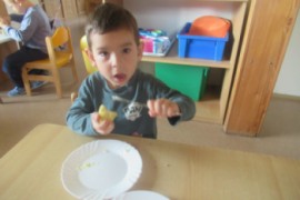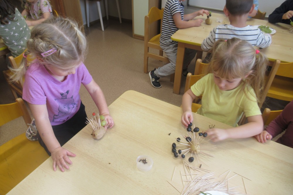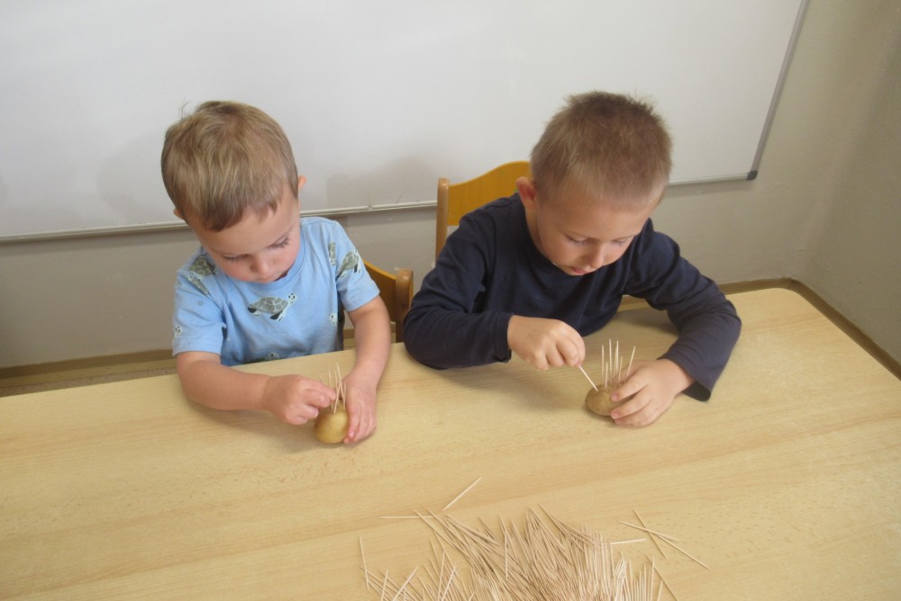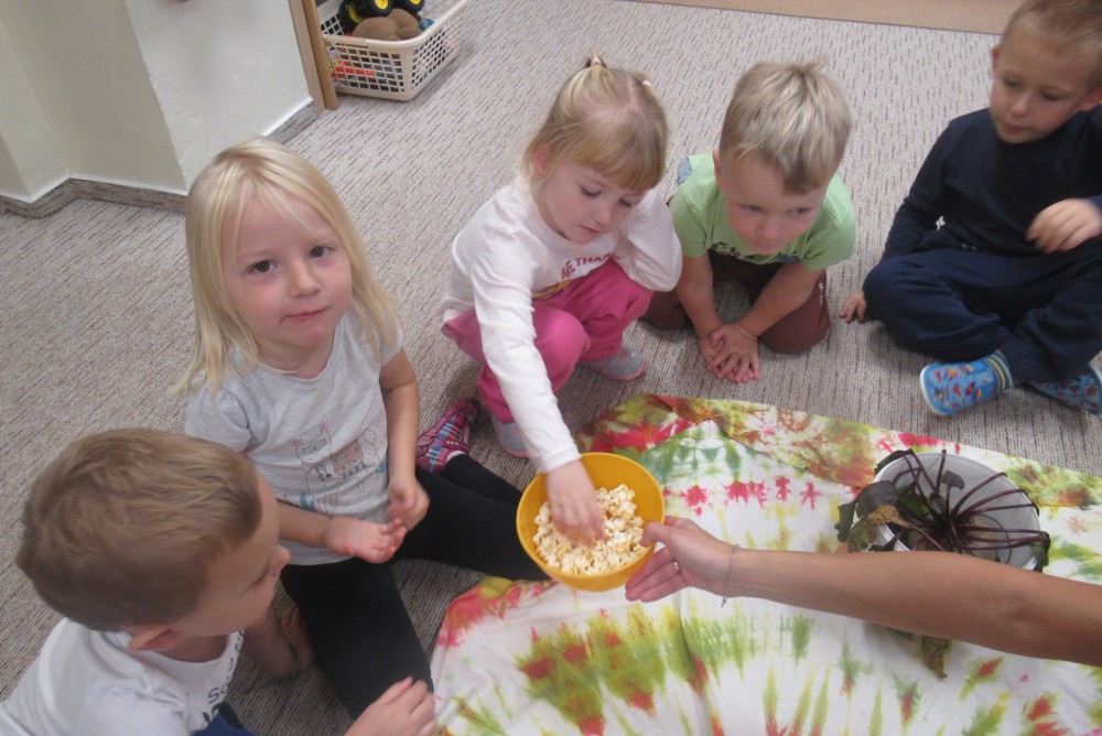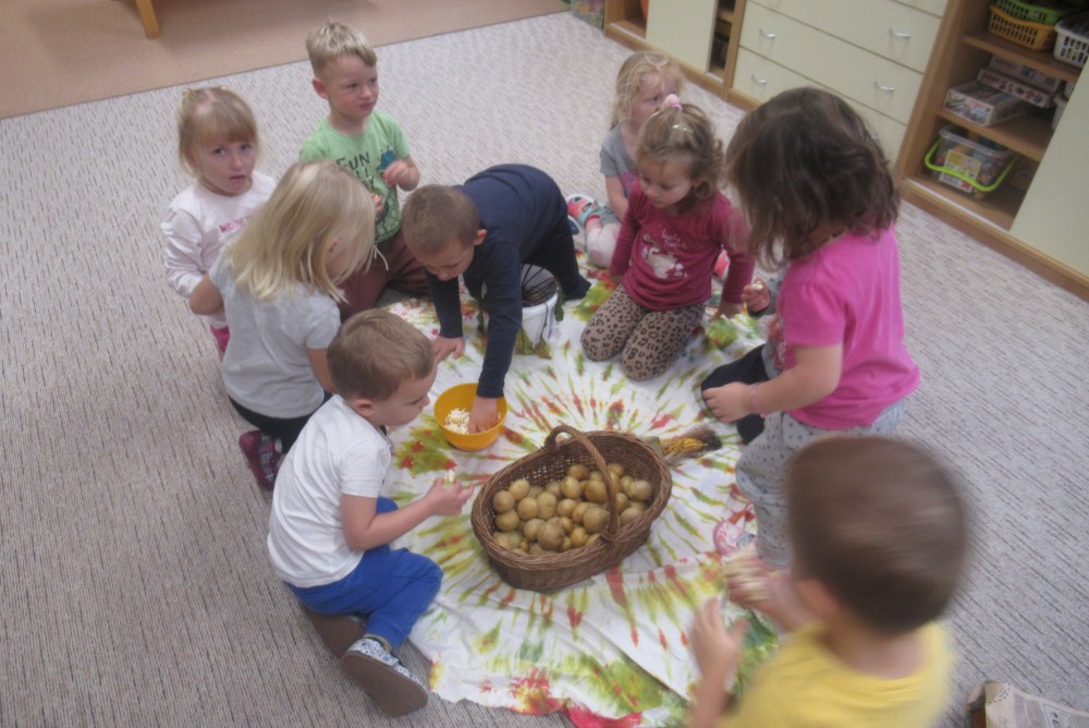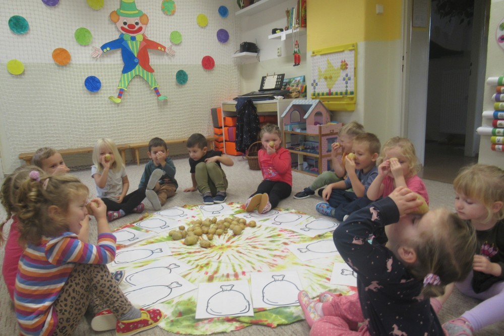 Šašek s dětmi poslouchal pohádku "O veliké řepě". Děti si zkusily pohádku zahrát. Na začátku týdne děti překonávaly překážky v podobě překážkové dráhy - slalom s bramborou, skákání v pytli, hod bramborou do košíku. Také se seznámily s pojmy větší a menší. Hledaly a počítaly brambory, řadily brambory podle velikostí, podle prostorových předložek si hrály s bramborou. Básnička ani písnička v tomto týdnu nechyběla. Naučily se písničku 1,2,3,4,5, poslední sloku "Šaška" a "Kutálí se ze dvora". Ke konci týdne děti vytvořily z brambor ježka, obtiskovaly brambory a nakonec brambory také uvařily a ochutnaly. Ochutnaly také sladký popcorn, který všem chutnal. Když už měly vše hotové, tak nám nezbývalo, než ještě pytel zavázat. Děti si zkusily nejdříve uzlíky na tkaničce a poté si pytel s brambory zavázaly samy.