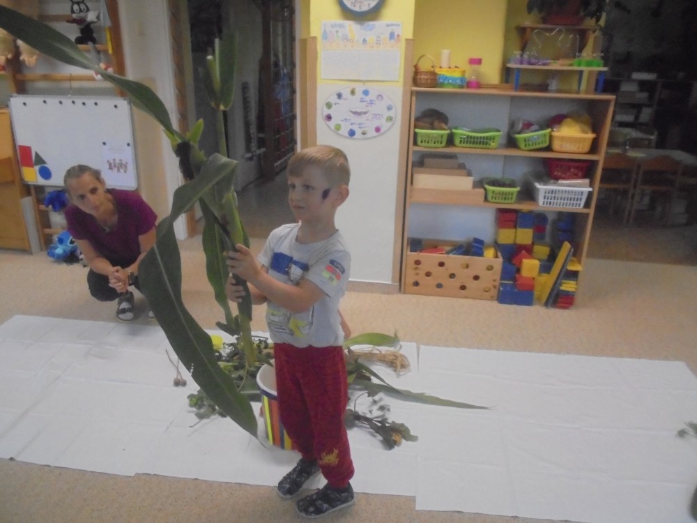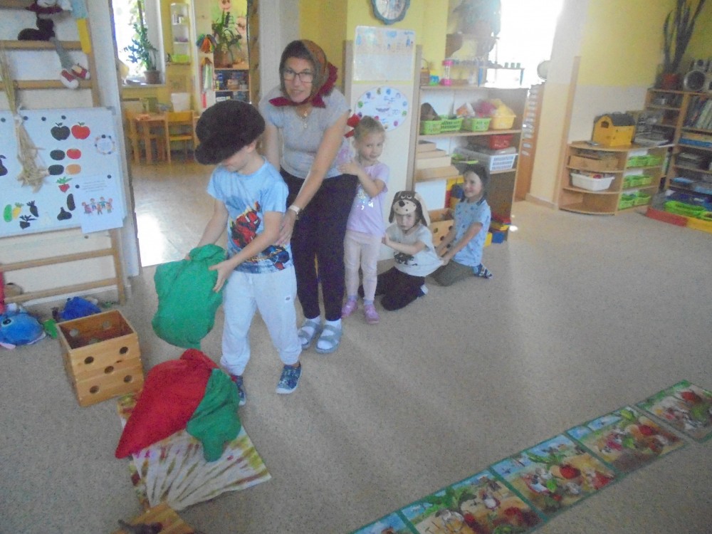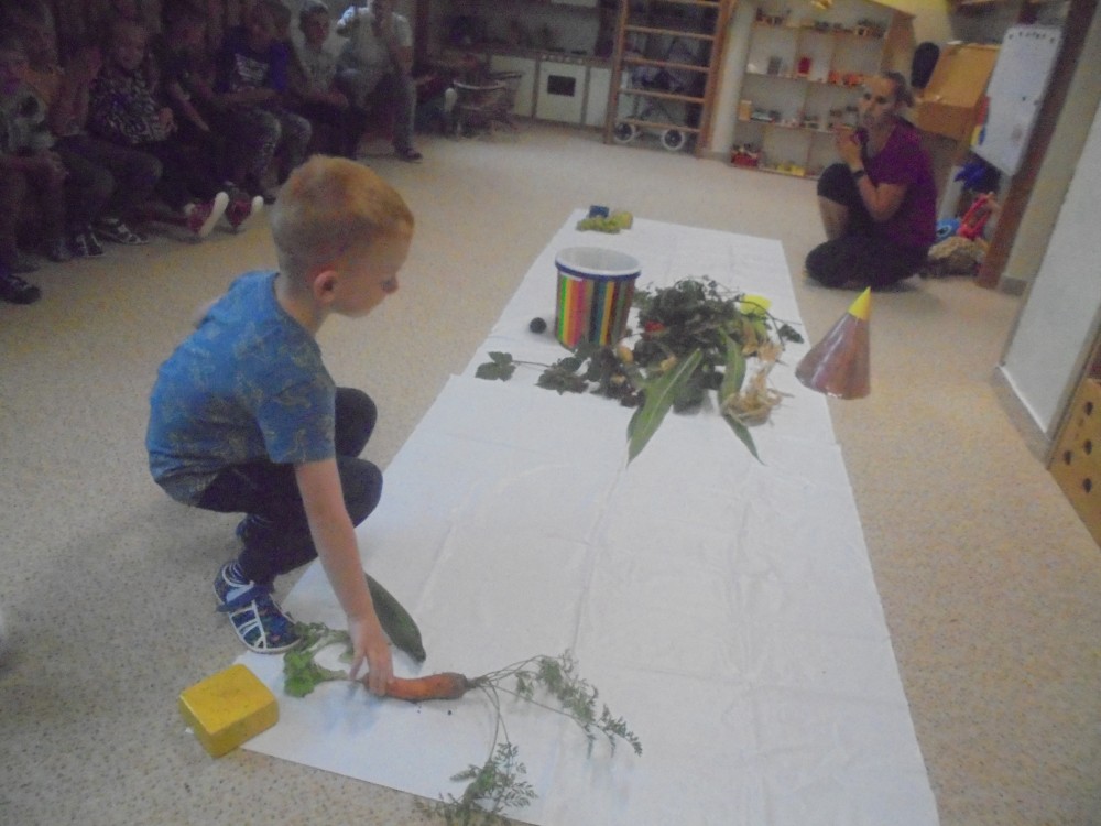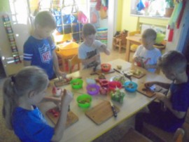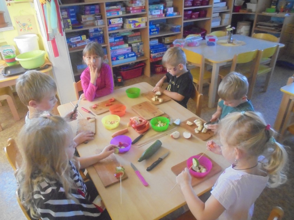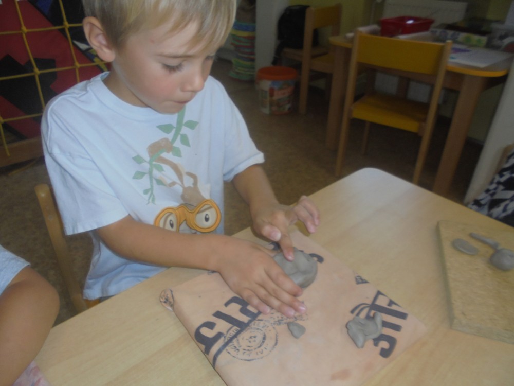 V tomto týdnu jsme si povídali, jaký je rozdíl mezi ovocem a zeleninou, roztřídili jsme dané druhy a každý si vytvořil ovocný nebo zeleninový špíz. Také jsme si společně uvařili zeleninovou polévku. Velmi se nám povedla, všechnu jsme snědli. Zahráli jsme si pohádku ,,O veliké řepě“ při níž jsme si zopakovali matematickou řadu. Ve výtvarném tvoření děti vystřihly "košík a naplnily ho" různými druhy ovoce a zeleniny, které malovaly temperovými barvami. Děti se naučily tanečky s doprovodem lidových písní - ,,Šla Nanynka do zeli“, ,,Cib, cib, cibulenka“ a ,, Šel zahradník do zahrady“. A na konci týdne si děti z keramické hlíny vytvořily stojánek na tužky ve tvaru jablíčka.