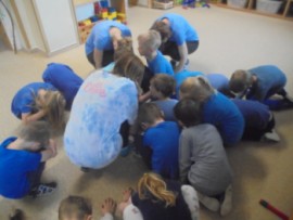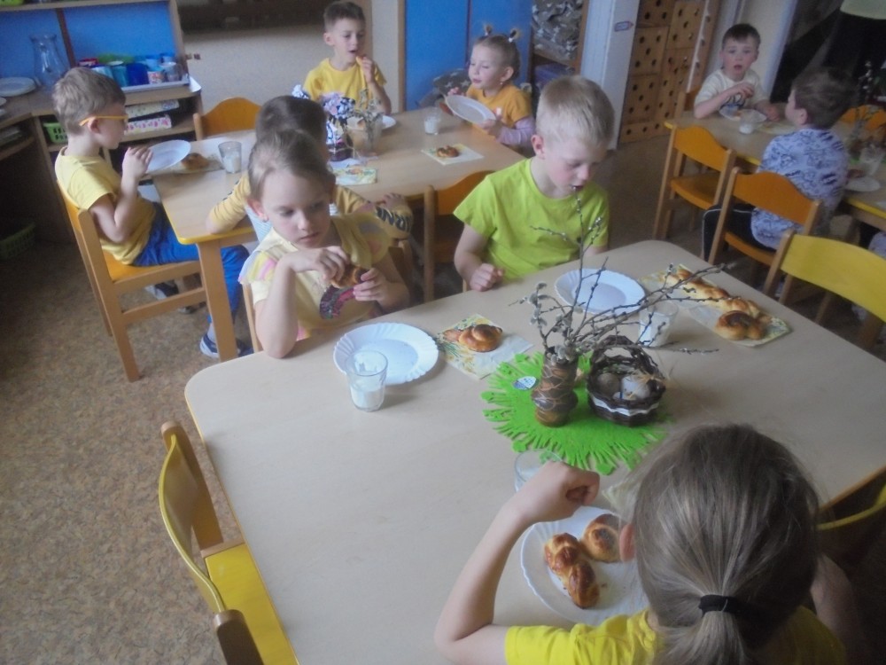 Hody, hody, doprovody... Nejčastější koleda, kterou kluci v tělocvičně koledovali s pomlázkou a děvčata jim vázaly barevné pentličky. Společně jsme si pověděli tradice i zvyky Pašijového týdne. Hráli jsme si s barevnými odstíny modré i žluté barvy a také jsme je spolu smíchali. Na Hubertově stezce jsme se vydali jarní stezkou za velikonočním zajíčkem, kde za splnění úkolů na děti čekala odměna:-) Jarní knížku děti doplnily velikonoční skládankou a společně jsme popřáli veselé Velikonoce i ve škole a školní jídelně. Barevný Pašijový týden se vyvedl. A tak i vám přejeme sluníčkové a hodně veselé Velikonoce.Foto z plavání najdeta v aktualitách pro rodiče