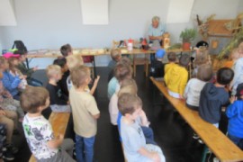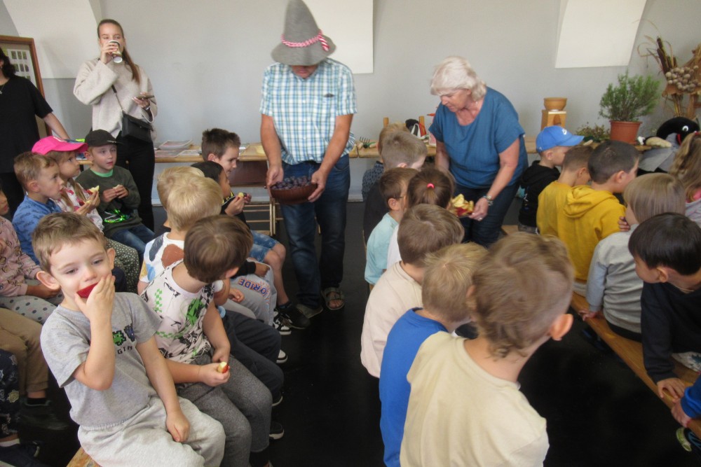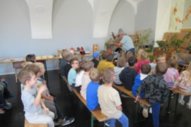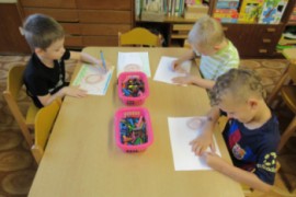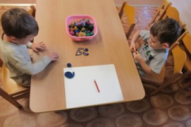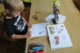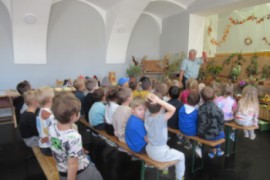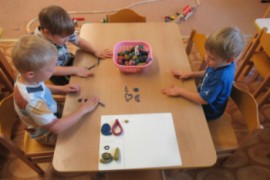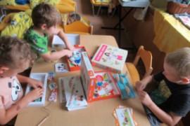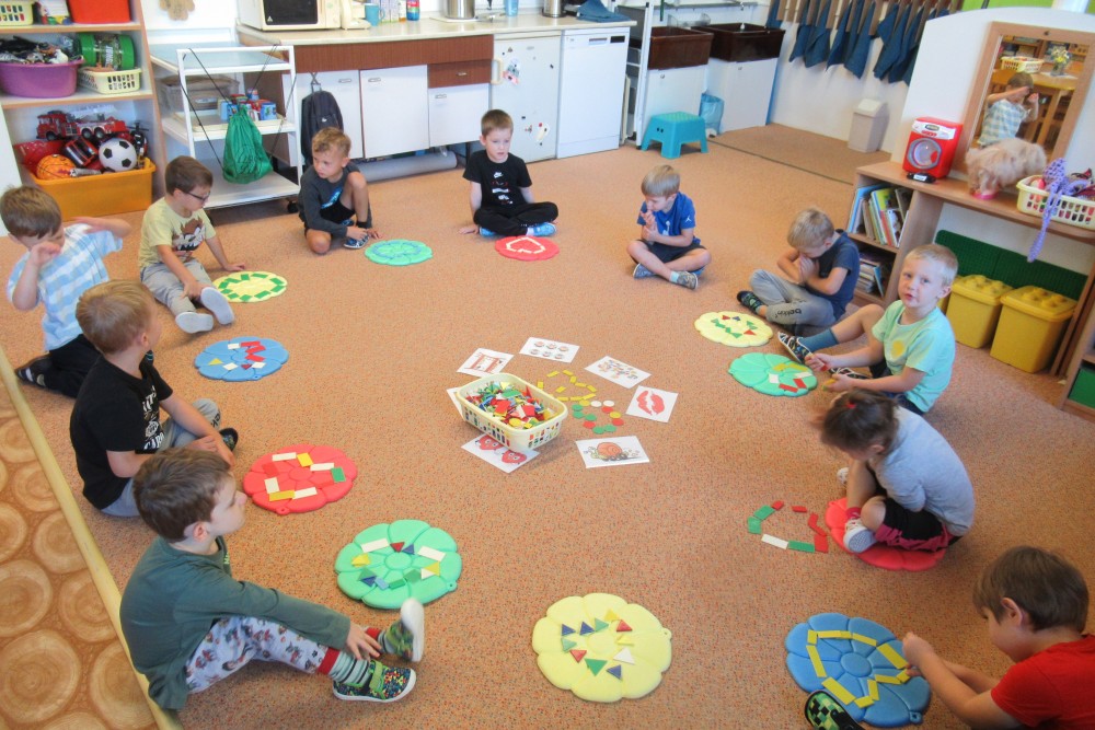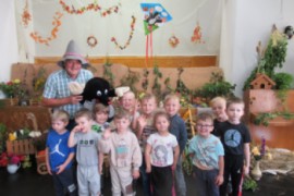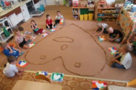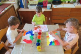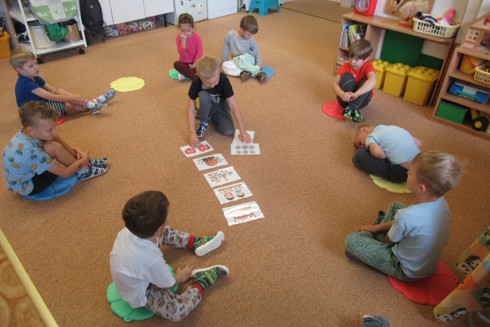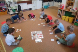 Kocourek Lumpík, jak si ho děti pojmenovaly, nás seznámil s pravidly MŠ. Nejprve nám o nich vyprávěl krátkou pohádku, která se dětem líbila. Hned věděly, co bylo v pohádce špatně. Pravidla si také vyzkoušely vymodelovat. Vyrazili jsme na výstavu ovoce a zeleniny. Malba "srdce v duze" děti zaujala a všem se povedla. Procvičení správného úchopu při kresbě šneka nesmělo chybět. Vyrazili jsme si na sportovní festival, kde si to všechny děti moc užily. Závěr týdne jsme si užili se smyslovými hrami.