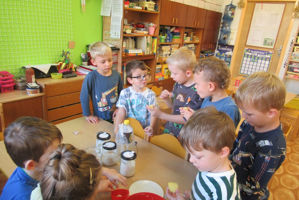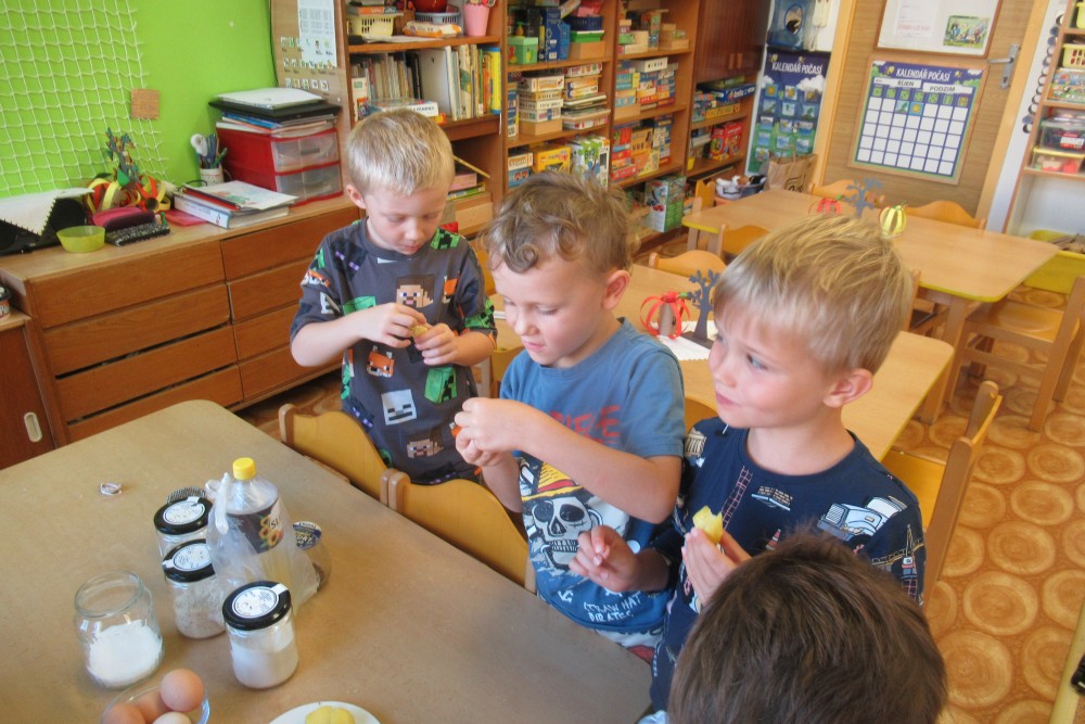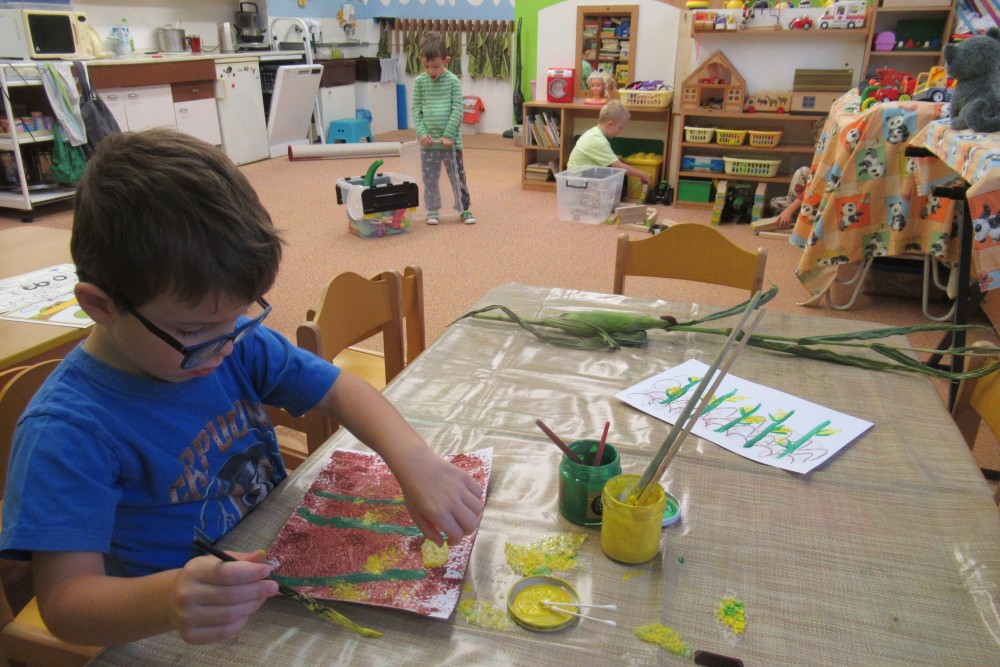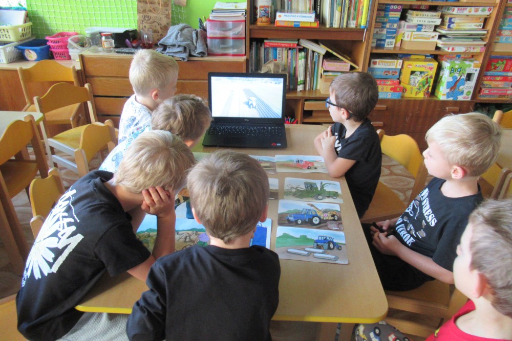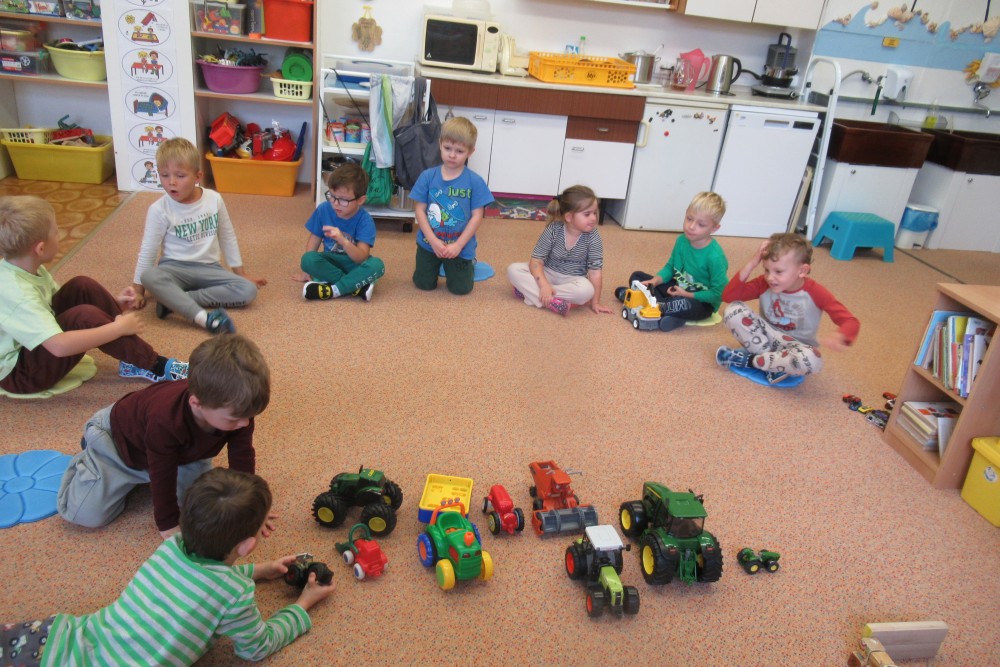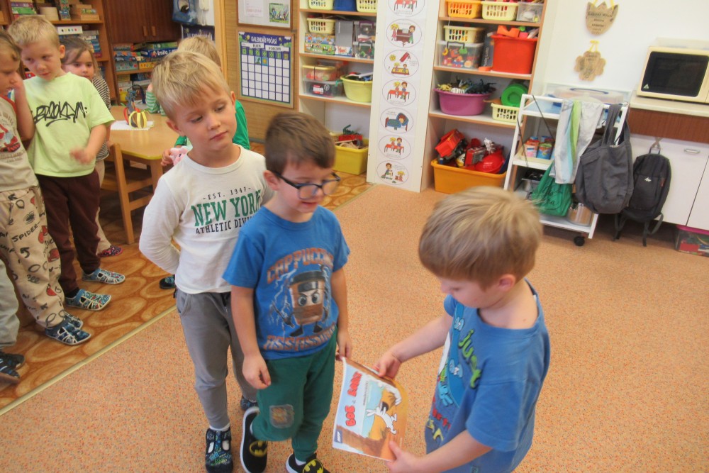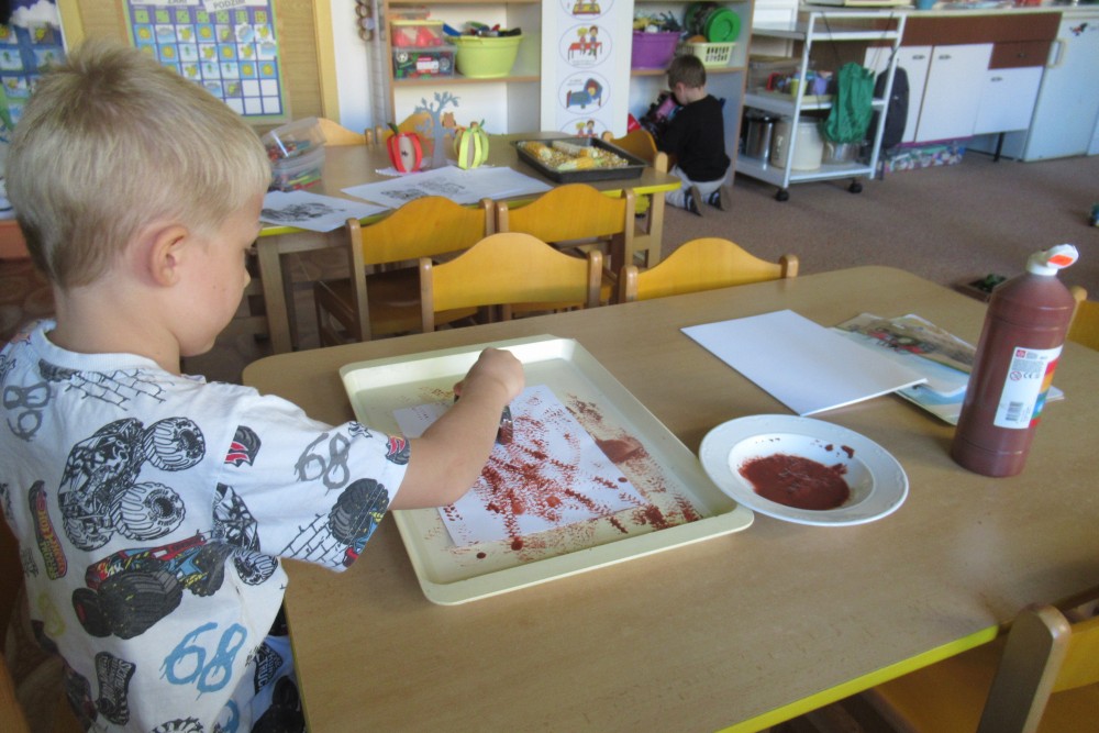 V pondělí jsme všichni navštívili knihovnu, kde jsme se dozvěděli o recyklaci papíru, zahráli si na knihovnici, která nám půjčoval knihy, V úterý jsme zdolávali překážkovou dráhu, kdo se trochu bál, pomohly jpaní učitelky A ve středu jsme si to užili v bazénu. Plavali jsme s pomůckami, foukali do vody, bylo fto fajn. Na počítači se děti podívaly, jaké podzimní práce dělají zemědělci na poli. Děti si hrály s traktory, stavěly jim garáže určovaly kam jedou, kde stojí. Děti poznávaly plody z pole. Loupaly kukuřici, třídily hrách a fazole pinzetou. Nejvíc e si děti užily vaření - bramborák, bramborové placky, ani na maminku nezbyo. A malování doplnilo kreativní týden. Děti namalovaly pole s kukuřicí a pole plné zeli. A s Mathym a Péťou jsme společně oslavili jejich páté narozeniny.