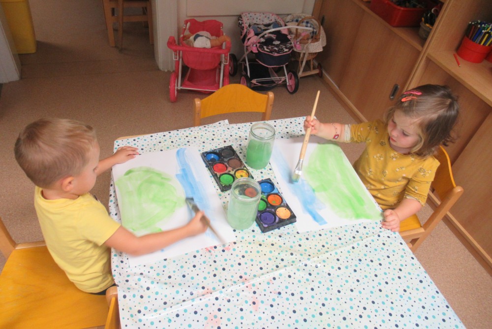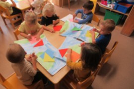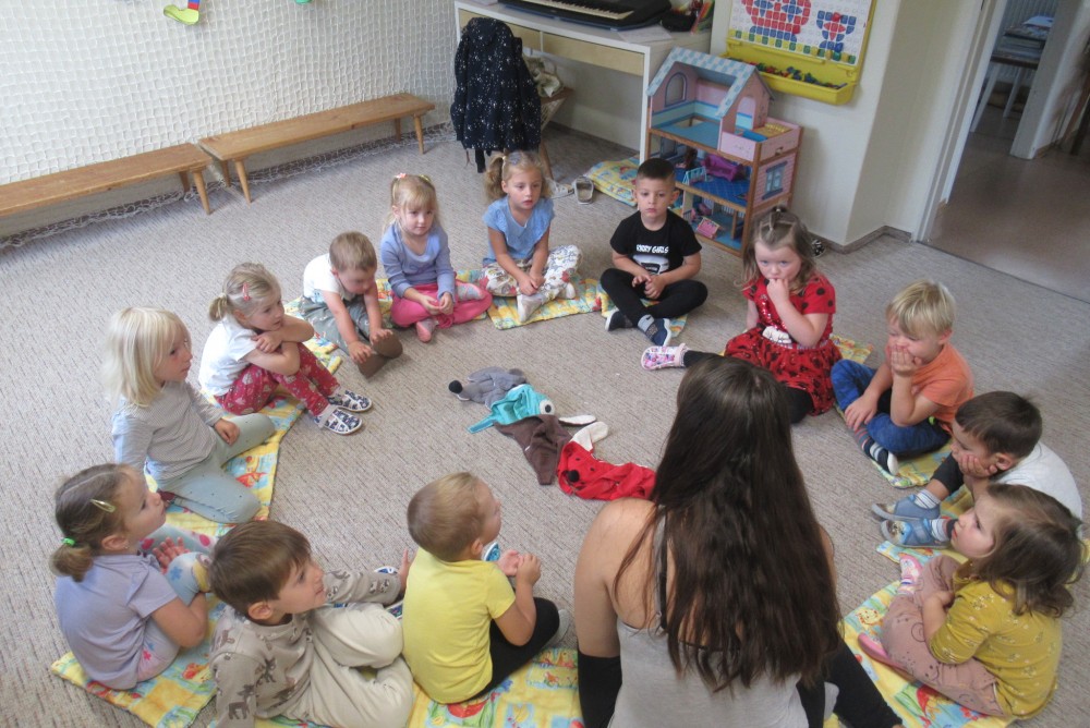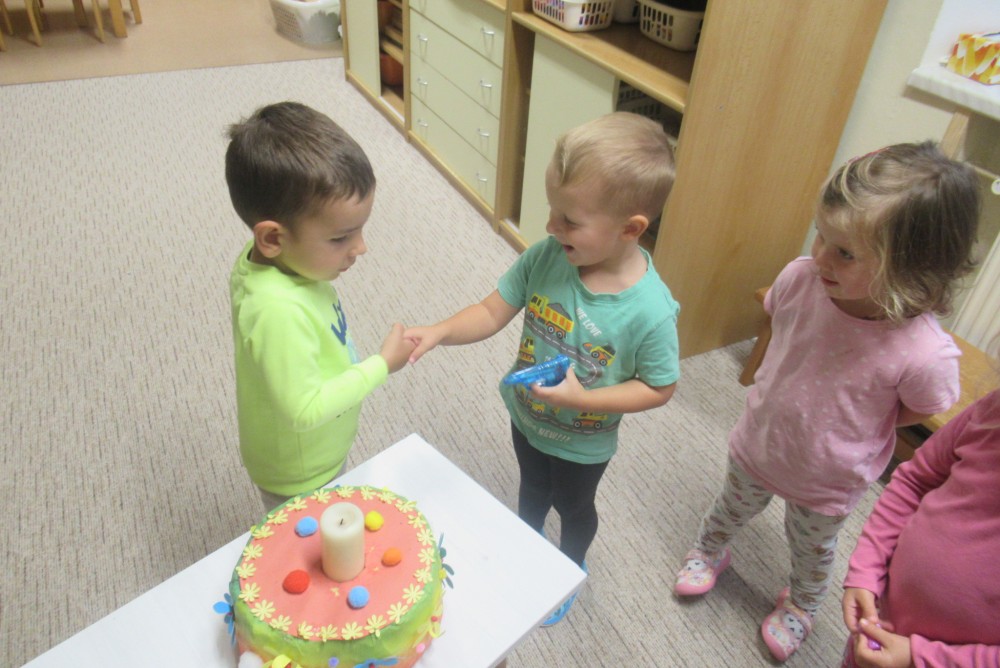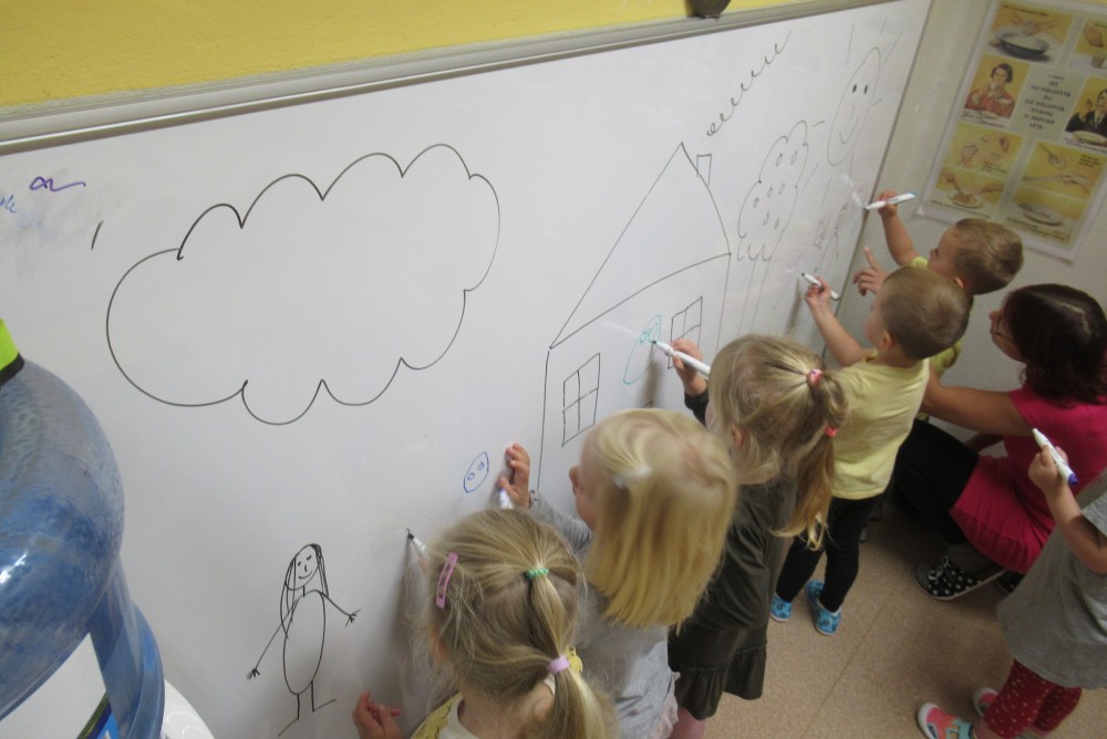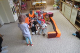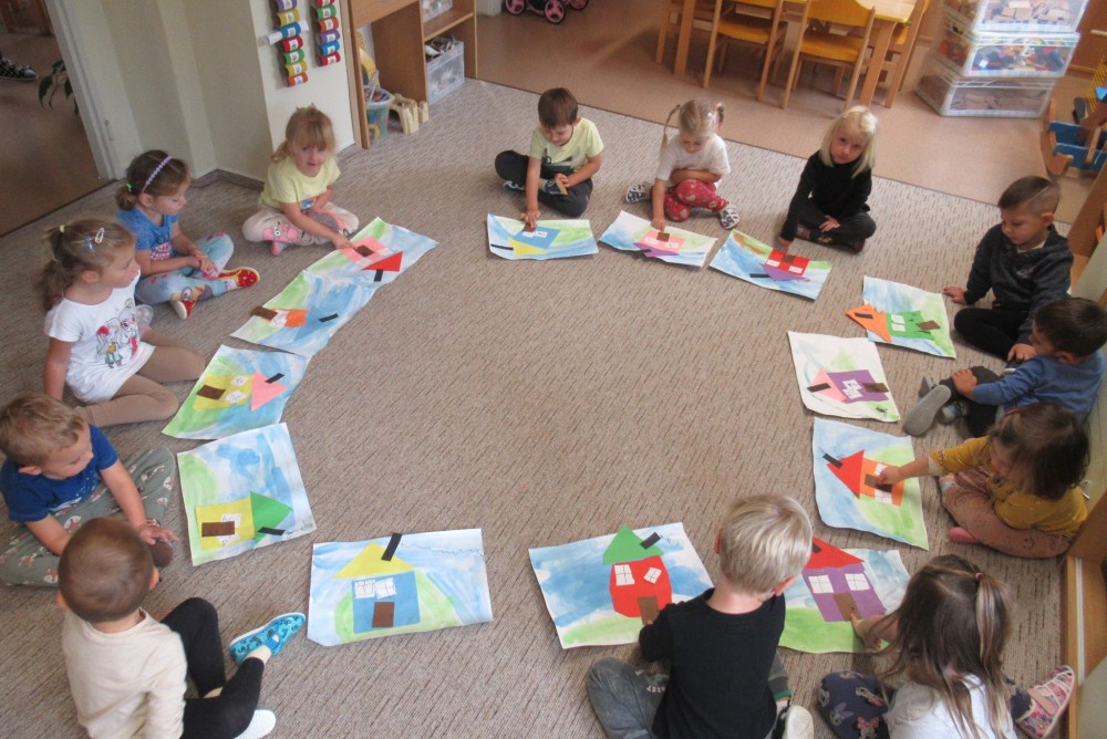 Boudo budko, kdo v tobě přebívá? Tuhle oblíbenou pohádku si děti poslechly, vyjmenovávaly a počítaly zvířátka, postavily veliký domeček z molitanových kostek a pohádku si i s maskami zvířátek zahrály. Dětem se pohádka tak moc líbila, že ji chtěly hrát každý den. S dětmi jsme si povídali, jak vypadá dům,ve kterém každý z nás bydlí, pojmenovávali jsme různé části, co každý domeček má - okna, komín dveře, střecha... Domeček jsem si samozřejmě také vytvořili - za pomoci vodových barev děti nakreslily pozadí (kopeček a nebe) a pomocí barevných papírů, nůžek a lepidla si každý poskládal svůj vlastní barevný domeček, za dopravu básničky Byl jednou jeden domeček, která se dětem moc líbila.