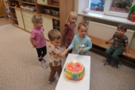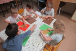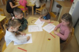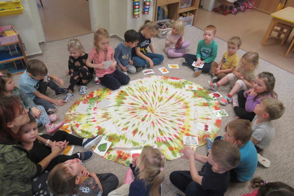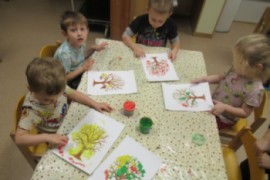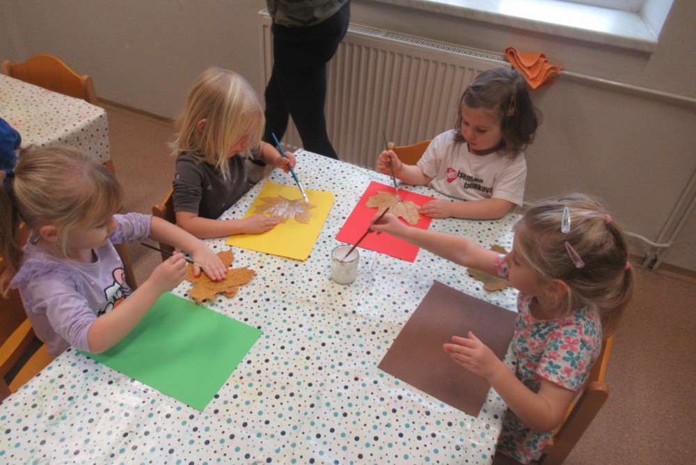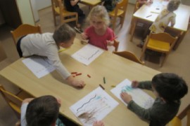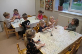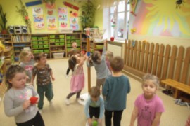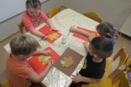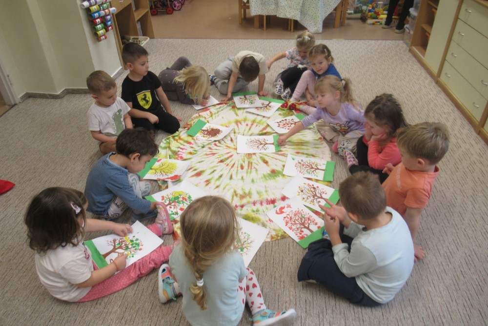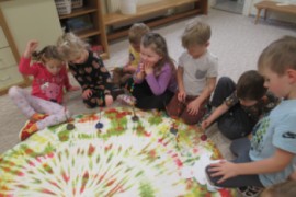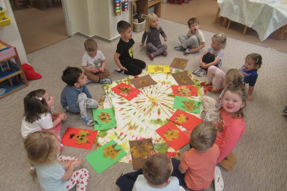 Jaké barvy nám šašek Honzík namíchal na lístky podzimu? Pokud to ještě někdo neví, tak ať se zeptá našich dětí. S dětmi jsme si povídali o barvách, udělali jsme si pokus s barvami a naučili jsme se básničku "Podzim". Na procházce jsme nasbírali javorové lístky na našeho "Vlka". Děti odelovaly barevné lístečky (kuličky), které dávaly na větvičku stromu. Děti malovaly prstíky lístečky a vznikly tak krásné barevné podzimní stromy. Stromy s barevnými lístky si děti zkusily postavit i z dřevěných kostek. Zahráli jsme si hru "Barevné, padající lístečky". a naučili jsme se písničku "Foukej, foukej větříčku," aby nám ty krásné barevné lístečky padaly ze stromů na zem. I v grafomotorice si děti vyzkoušely jak padá listí.
