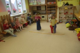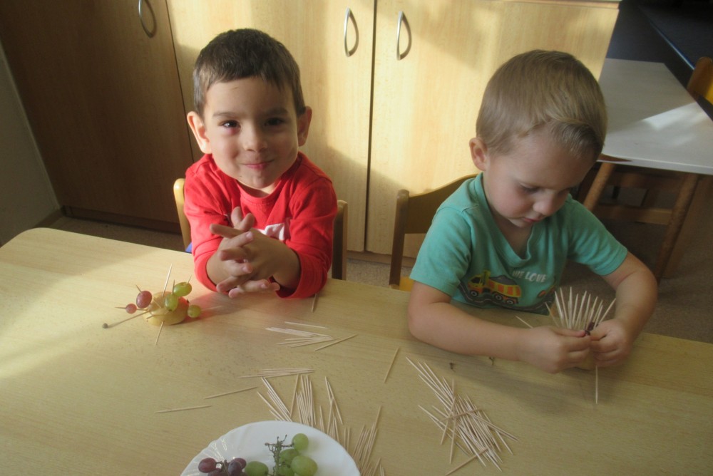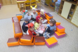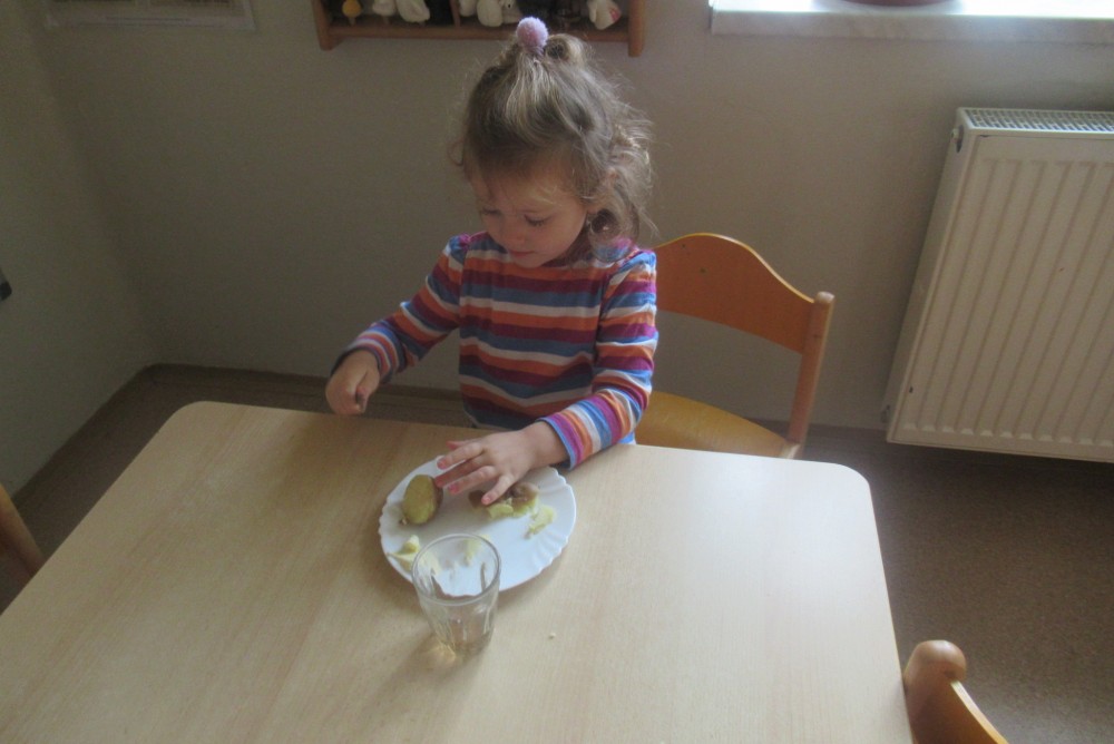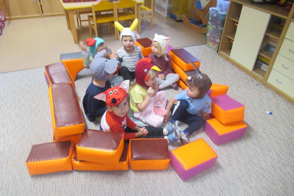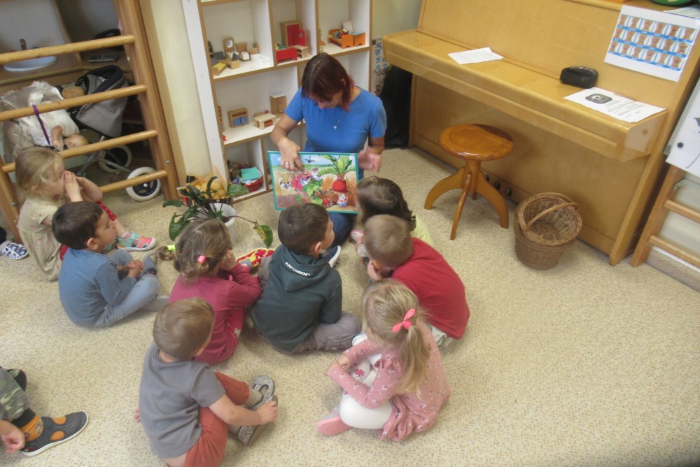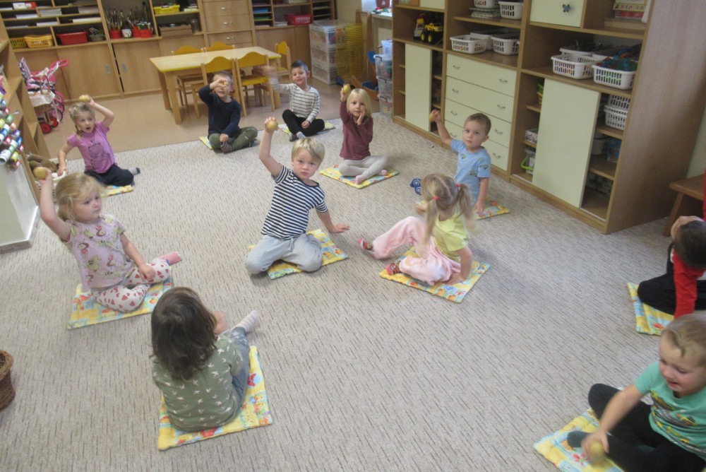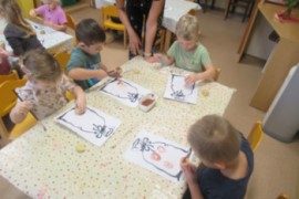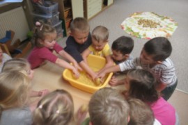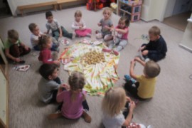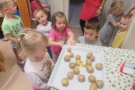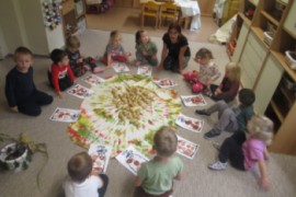 Šašek s dětmi poslouchal pohádku "O veliké řepě". Děti si zkusily pohádku zahrát. Na začátku týdne děti překonávaly překážky v podobě překážkové dráhy - slalom s bramborou, skákání v pytli, hod bramborou do košíku. Také se seznámily s pojmy větší a menší. Hledaly a počítaly brambory, řadily brambory podle velikostí, podle prostorových předložek si hrály s bramborou. Básnička ani písnička v tomto týdnu nechyběla. Naučily se písničku 1,2,3,4,5, poslední sloku "Šaška" a "Kutálí se ze dvora". Ke konci týdne děti vytvořily z brambor ježka, obtiskovaly brambory a nakonec brambory také uvařily a ochutnaly. Ochutnaly také sladký popcorn, který všem chutnal. Když už měly vše hotové, tak nám nezbývalo, než ještě pytel zavázat. Děti si zkusily nejdříve uzlíky na tkaničce a poté si pytel s brambory zavázaly samy.