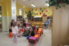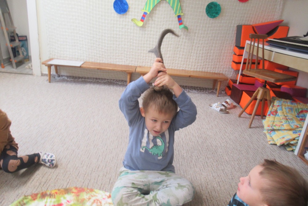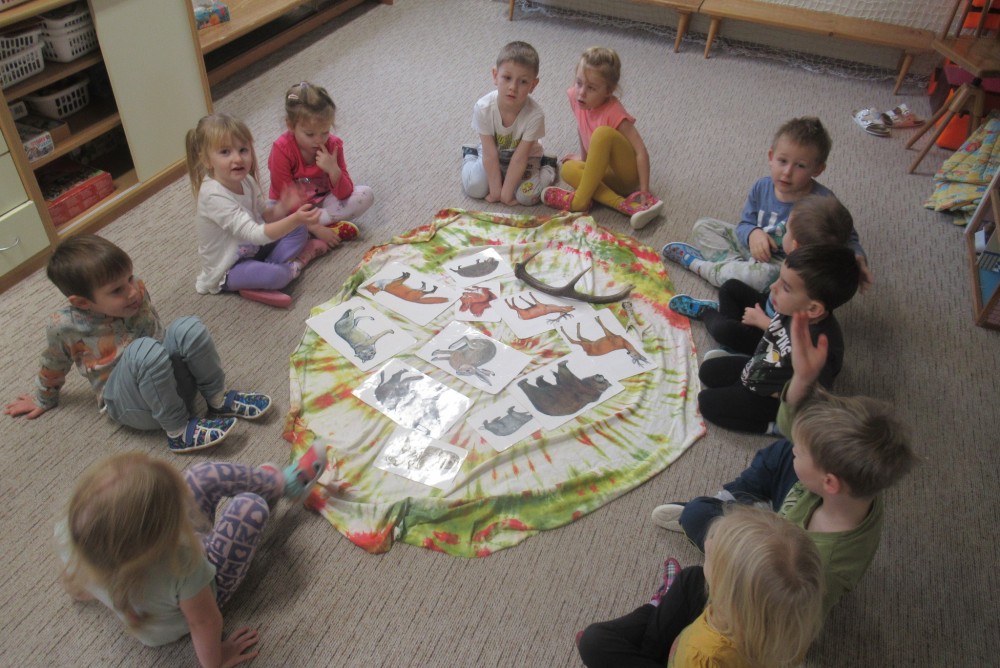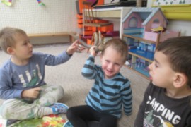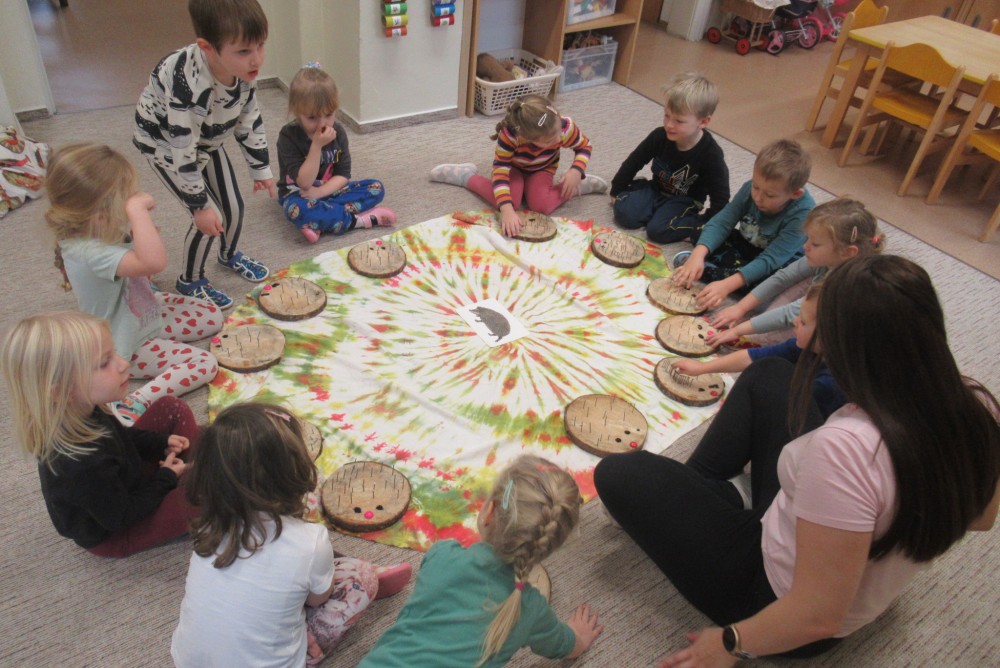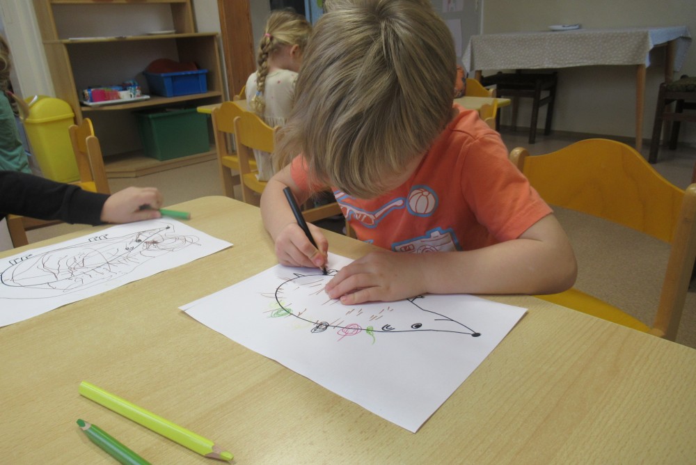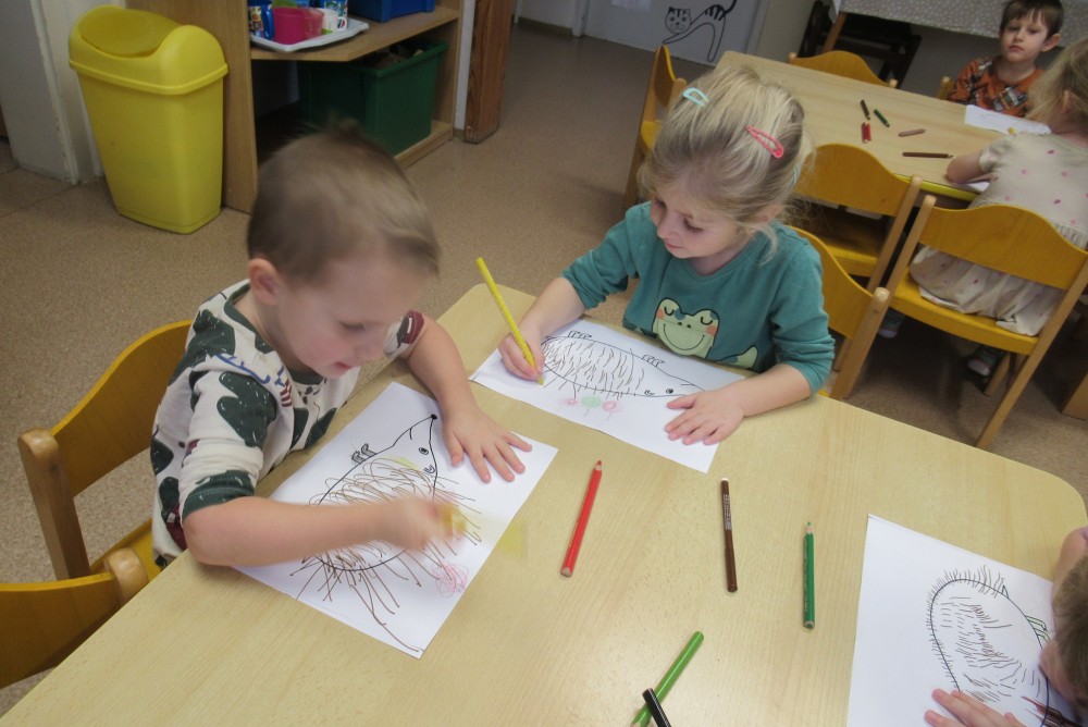 Týden jsme začali pohádkou O Smolíčkovi. Děti si prohlédly a vyzkoušely jelení parohy a srnčí parůžky a seznámily se i s dalšími obyvateli lesa. Děti zvířátka pojmenovávaly, vytleskávaly a poslechly si zvuky, které zvířata vydávají. Procházkou jsme se byli podívat i do lesa ke krmelci, kde měla zvířátka už nachystané dobroty na zimu. Letos poprvé jsme se šli podívat do dílny, kde děti vzaly do rukou kladívka a hřebíky a zatloukaly a zatloukaly až nám vznikli krásní ježečkové. Grafomotorikou jsme si procvičili krátké rovné čáry a děti dokreslily ježkům bodliny. A protože letos děti mají velmi rády dramatizaci, vytáhli jsme čepičky, postavili domeček a zopakovali jsme si pohádku Boudo budko a přidali jsme do ní i dvě nová zvířátka - ježka a jelena. Dětem se pohádka moc povedla a chtěly jí hrát znovu a znovu.