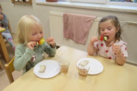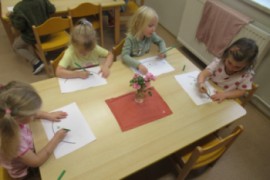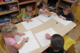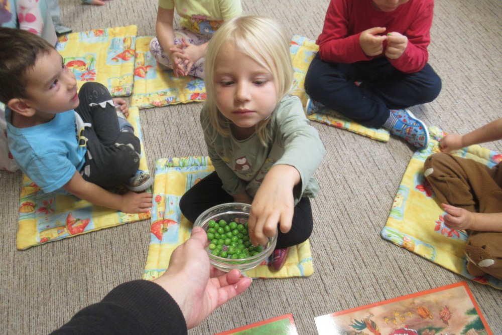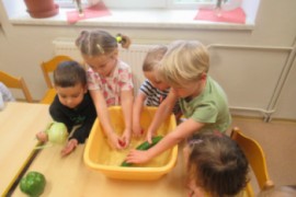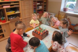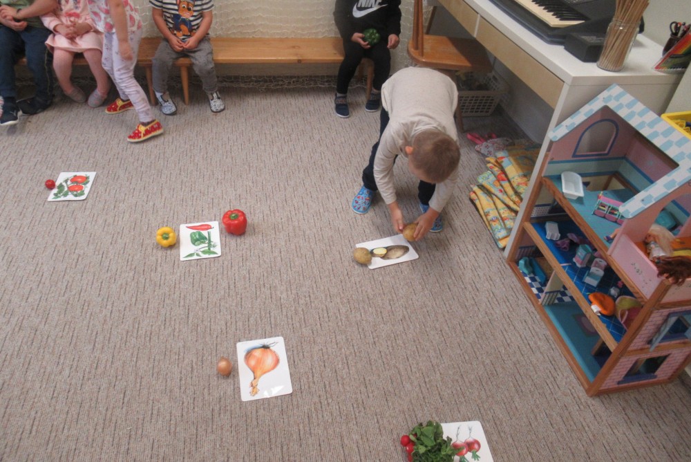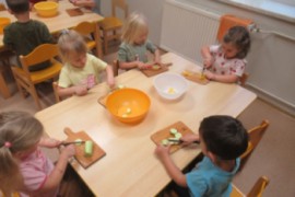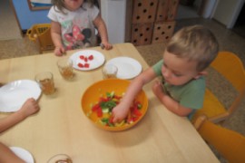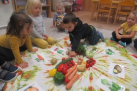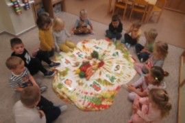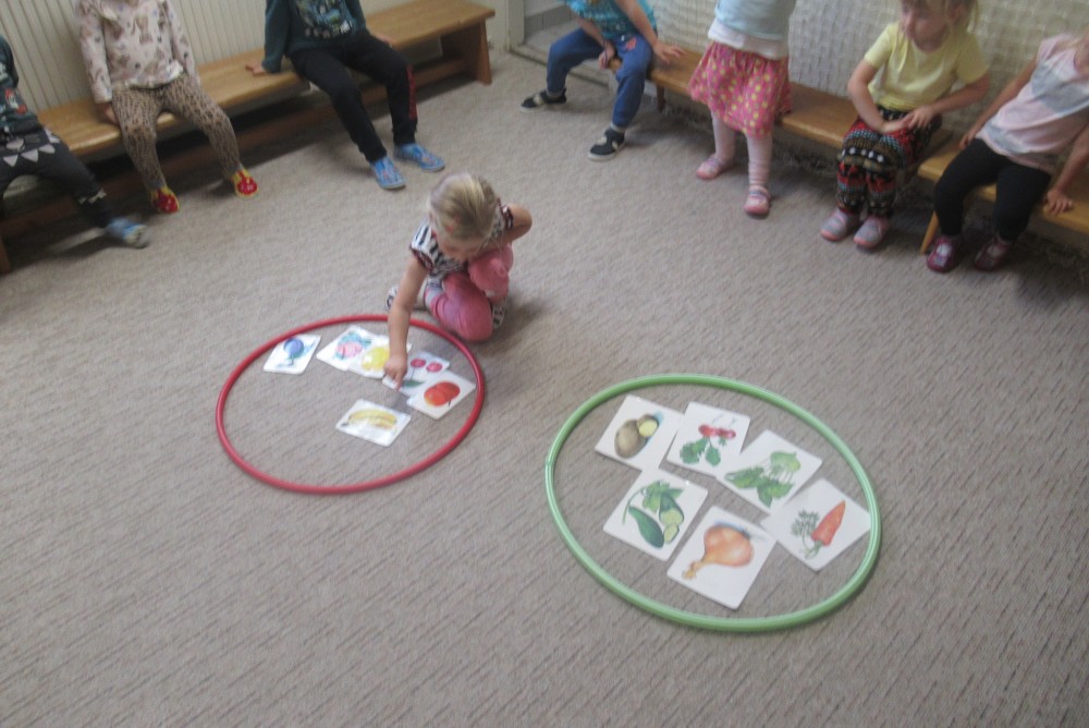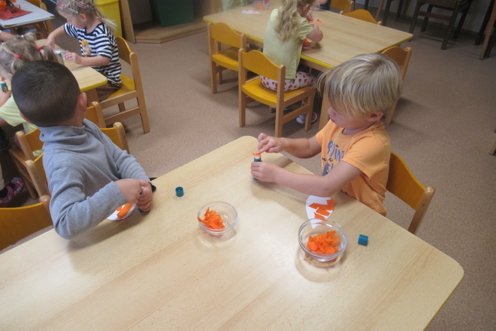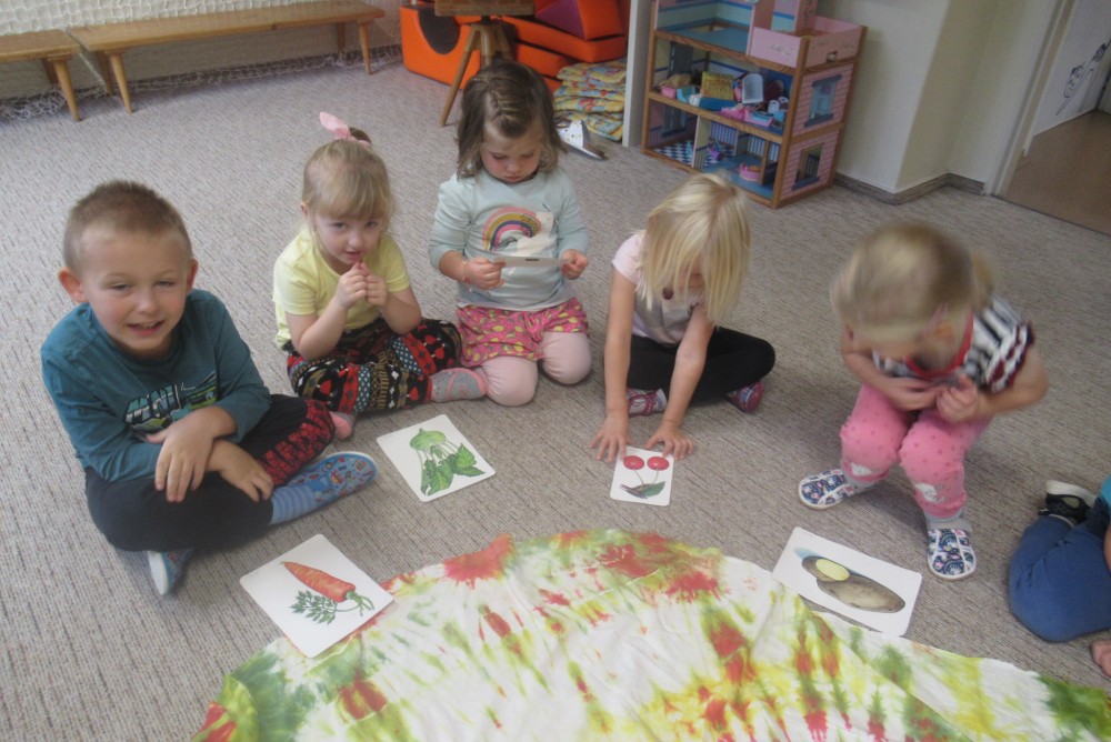 Co je ovoce, to už víme, ale co patří mezi zeleninu? Děti se seznámily s různými druhy zeleniny. Zeleninu jsme pojmenovávali, určovali jsme barvy a ochutnávali - nejvíce dětem chutnala okurka a červená paprika. A protože jsme měli zeleniny opravdu hodně, vzali jsme nože, prkénka a špejle do rukou a každý si vytvořil vlastní zeleninový špíz. Při pracovní činnosti jsem si procvičili trhání krepového papíru, práci s lepidlem a stříhání a s pomocí krabice nám vznikl krásný mrkvový záhonek. A protože zeleniny nebylo ještě dost, děti vymodelovaly rajče a okurku. Také si děti vyslechly pohádku O Budulínkovi, ochutnaly hrášek a procvičily si grafomotoriku při jeho malování. Úplně nejvíce ale děti bavilo zpívat a to hlavně písničku Cib, cib, cibulenka s tanečkem.